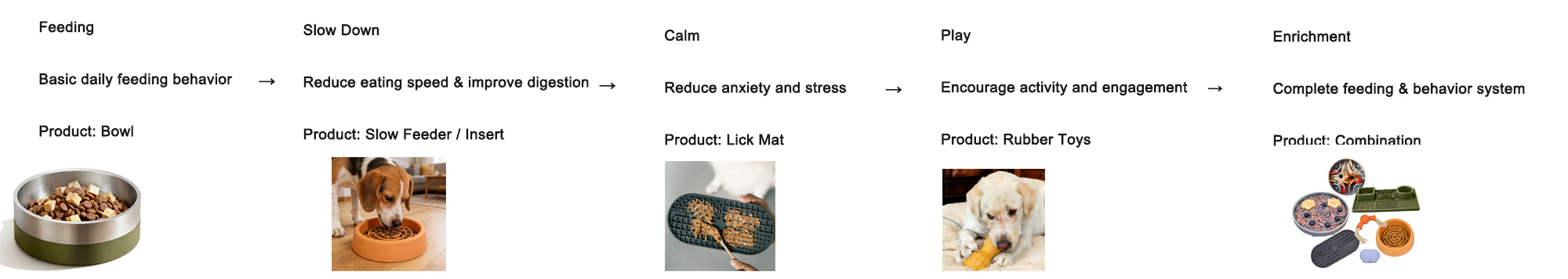 - Slow feeder bowls → control eating speed - Inserts → add flexibility and upgrade options - Lick mats → reduce stress and anxiety - Rubber toys → extend play and engagement